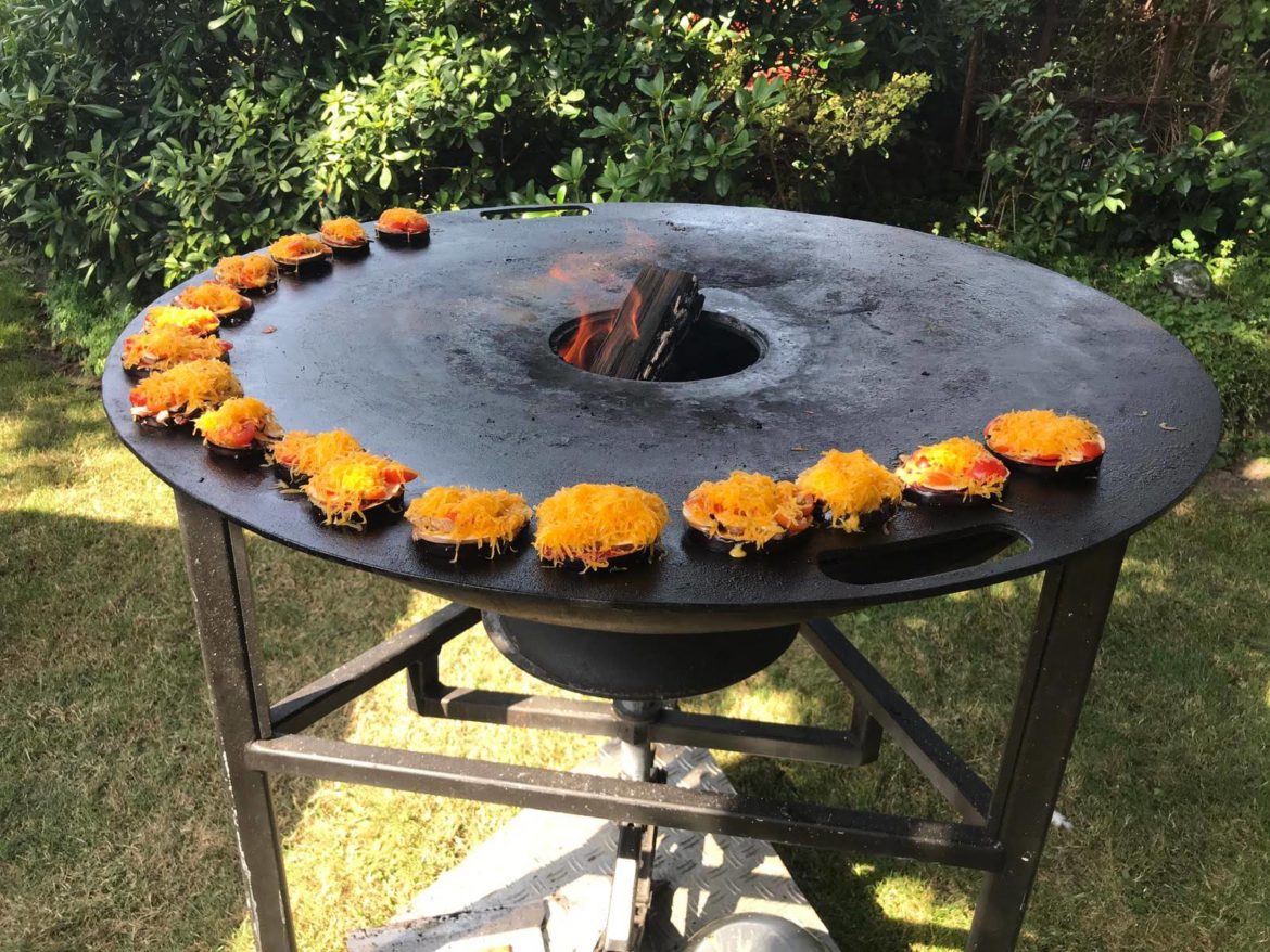 Die Aubergine wird in gleich dicke Scheiben geschnitten und von beiden Seiten gesalzen. Danach werden die Tomaten, Pilze und der Mozzarella in dünne Scheiben geschnitten. Die Aubergine wird mit Tomaten, Pilzen und Mozzarella nach Belieben belegt, dann leicht gepfeffert und mit geriebenen Gouda bestreut. Der Grill wird auf ein indirektes Setup eingestellt und die Temperatur auf ca. 200 °C eingeregelt. Nach ca. einer halben Stunde sind die Taler fertig.