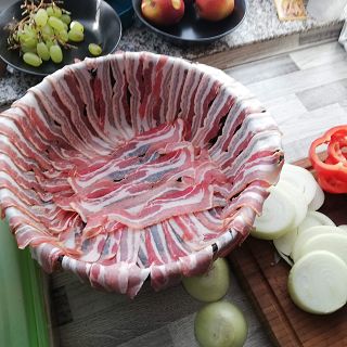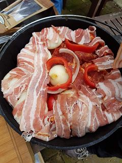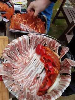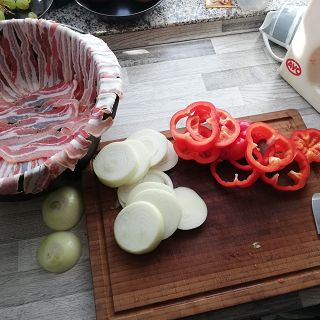 Der Schweinenacken wird in Daumendicke Scheiben geschnitten und mit BBQ-Rup gewürzt . Die Zwiebel und Paprika werden auch in Scheiben geschnitten. Wenn alles geschnitten ist wird der Dutch Oven mit dem Bacon ausgelegt , Nun wird das Fleisch und das Gemüse abwechselnd hochkant in den Dutch Oven geschichtet .