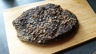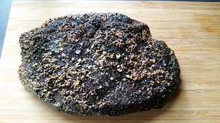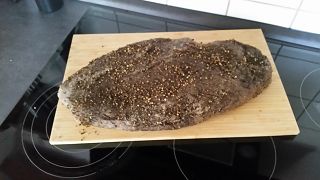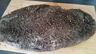 Nach einer Woche die Rinderbrust aus der Lake holen kurz unter kalten Wasser abspülen. Das Fleisch hat jetzt eine grauliche Färbung dies kommt von dem Pökelsalz und ist ganz normal. Die Rinderbrust trocken tupfen anschließend mit groben Schwarzenpfeffer ein reiben .