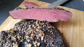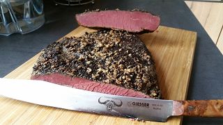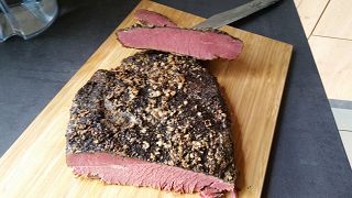 Die Rinderbrust wird in den Grill gelegt und bis zu einer Kerntemperatur von 68 °C geräuchert. Wenn die Kerntemperatur erreicht ist nimmt man die Rinderbrust vom Grill. Eigentlich wird ein Pastrami kalt in dünne scheiben geschnitten und dann gegessen aber es schmeckt auch hervorragend wenn es frisch und heiß ist.