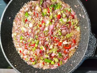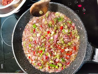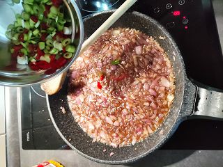 - 1. Denn Bacon in kleine Würfel schneiden und bei mittler Hitze auslassen, die Zwiebel, Chilischote werden in dünne Scheiben geschnitten. Wenn der Bacon schön knusprig ist aus der Pfanne nehmen.