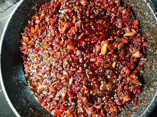 - 2. Die Zwiebel werden in dem Fett vom Bacon gläsig gebraten nun die Chili und den Zucker dazu geben. Wenn der Zucker geschmolzen ist, wird mit den flüssigen Zutaten abgelöscht.
